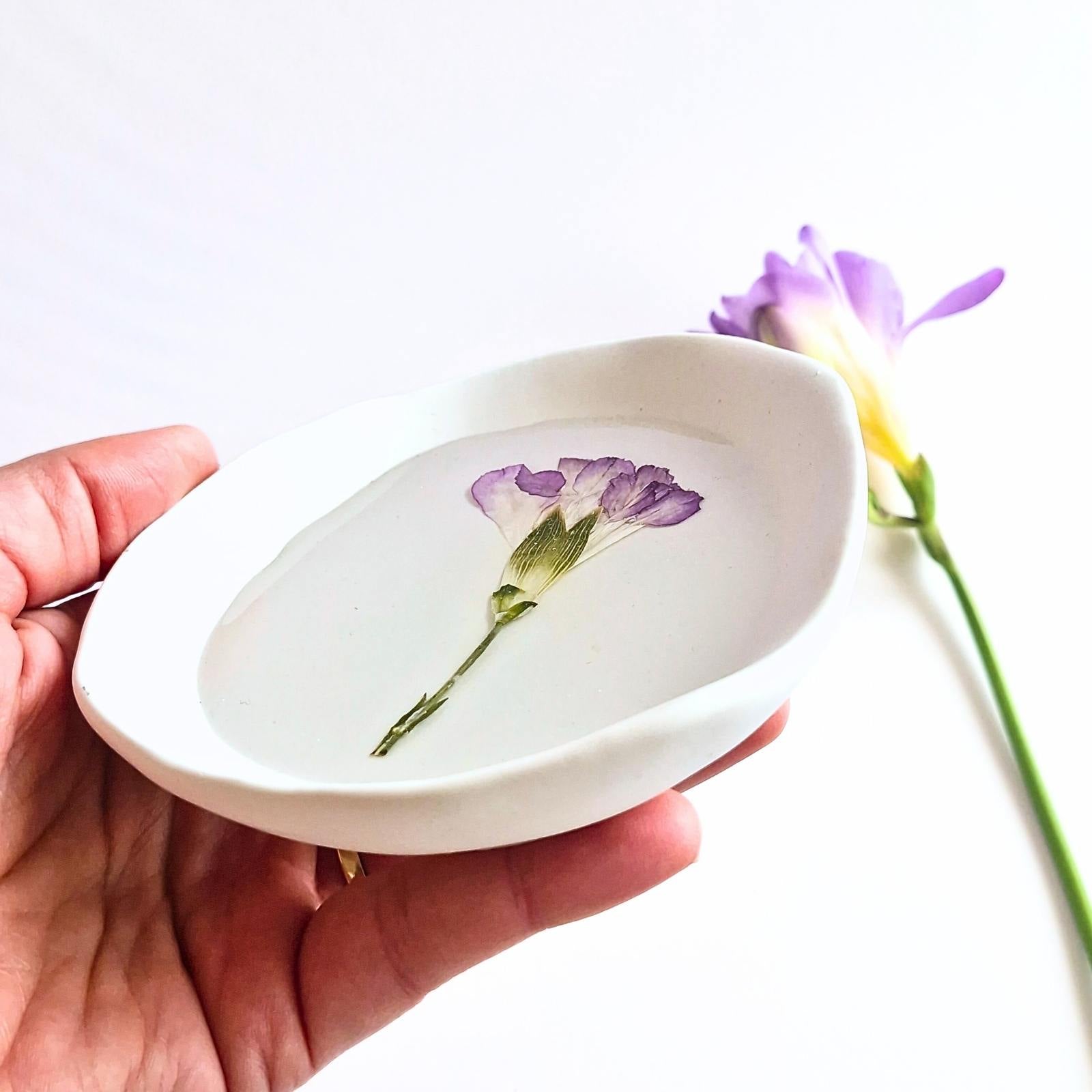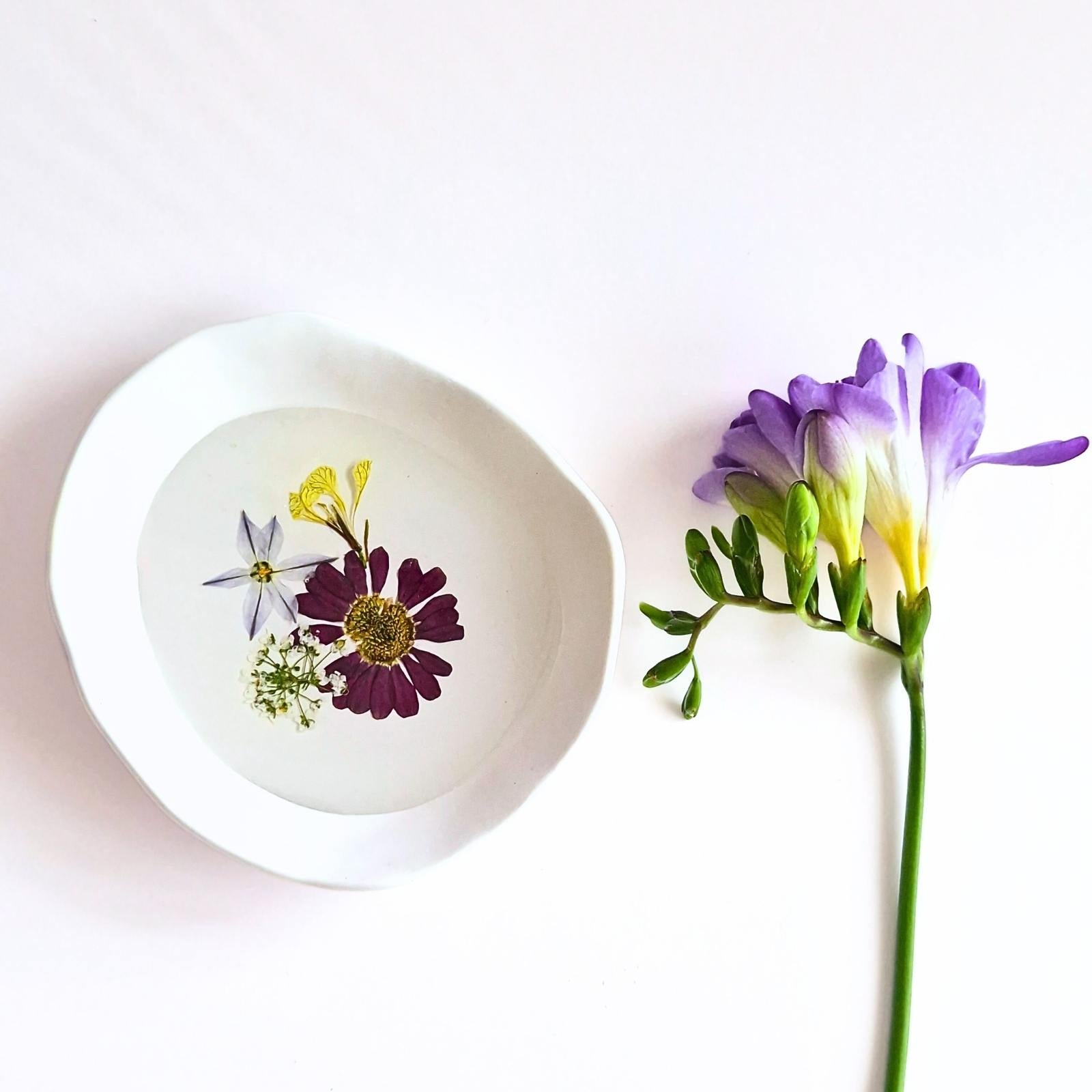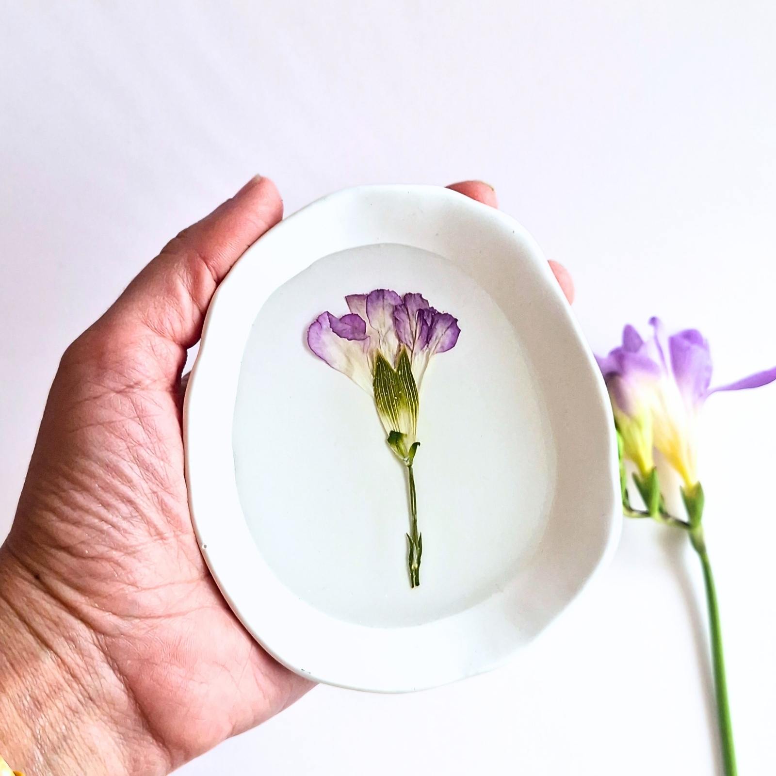 Handcrafted botanical jewellery dish featuring real pressed flowers individually preserved in crystal-clear epoxy resin. Each tray showcases authentic pressed flowers and botanicals set in durable acrylic resin, creating unique functional art perfect for jewellery display/storage.