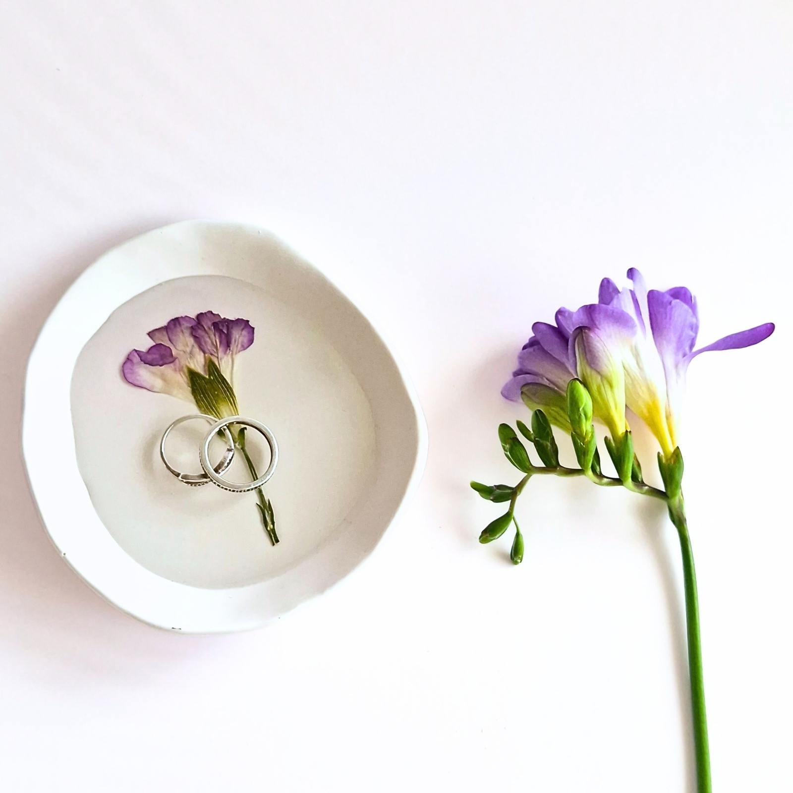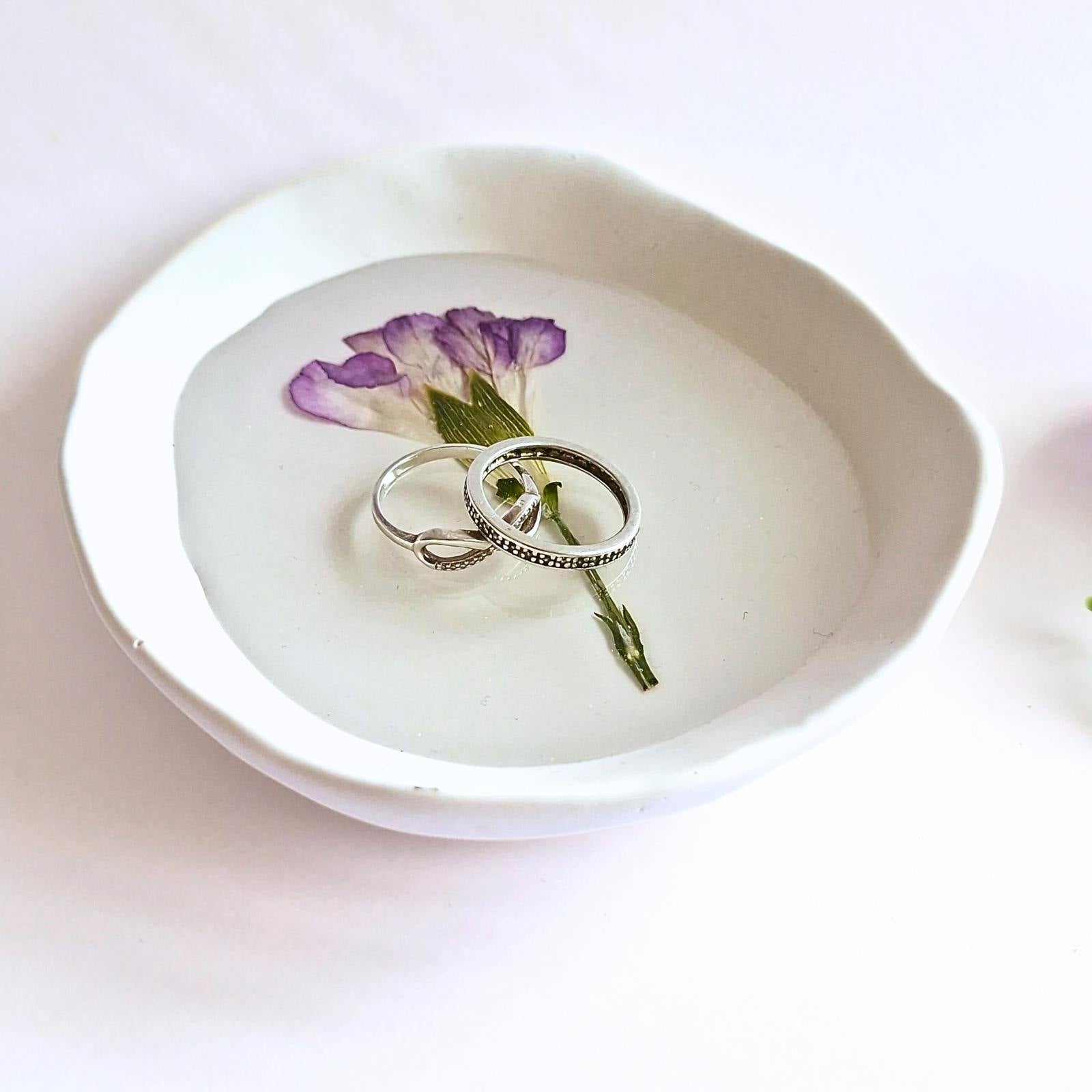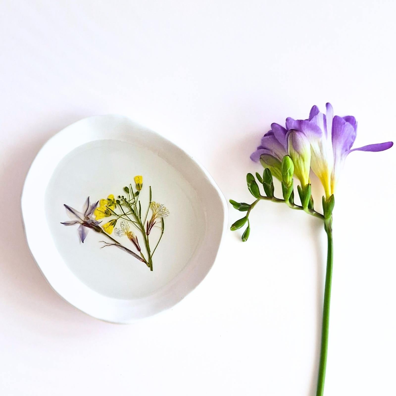 Handcrafted botanical jewellery dish featuring real pressed flowers individually preserved in crystal-clear epoxy resin. Each tray showcases authentic pressed flowers and botanicals set in durable acrylic resin, creating unique functional art perfect for jewellery display/storage.