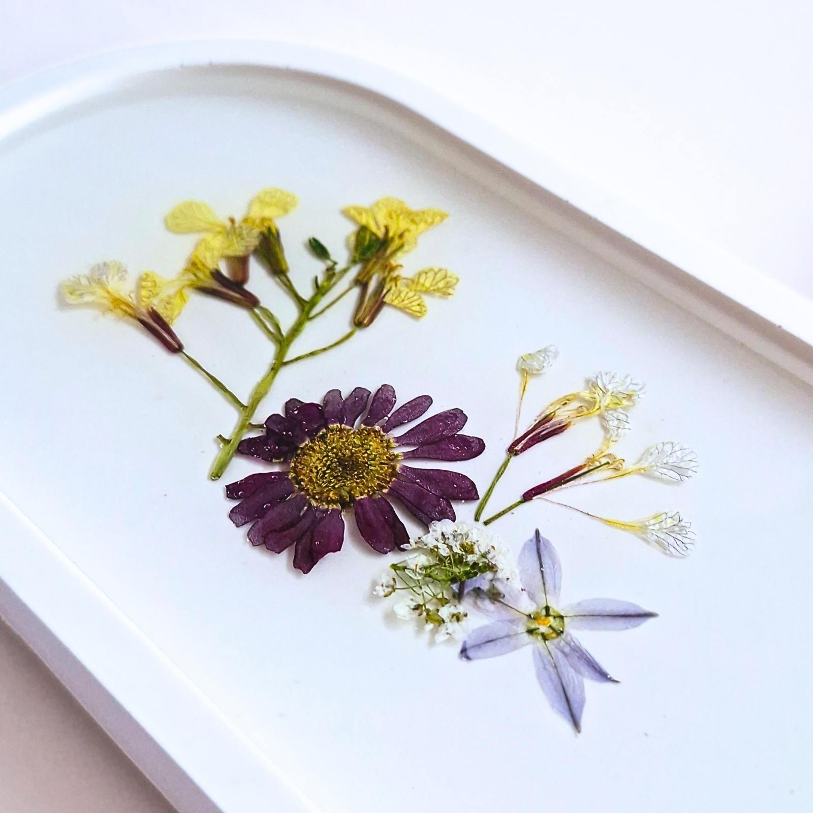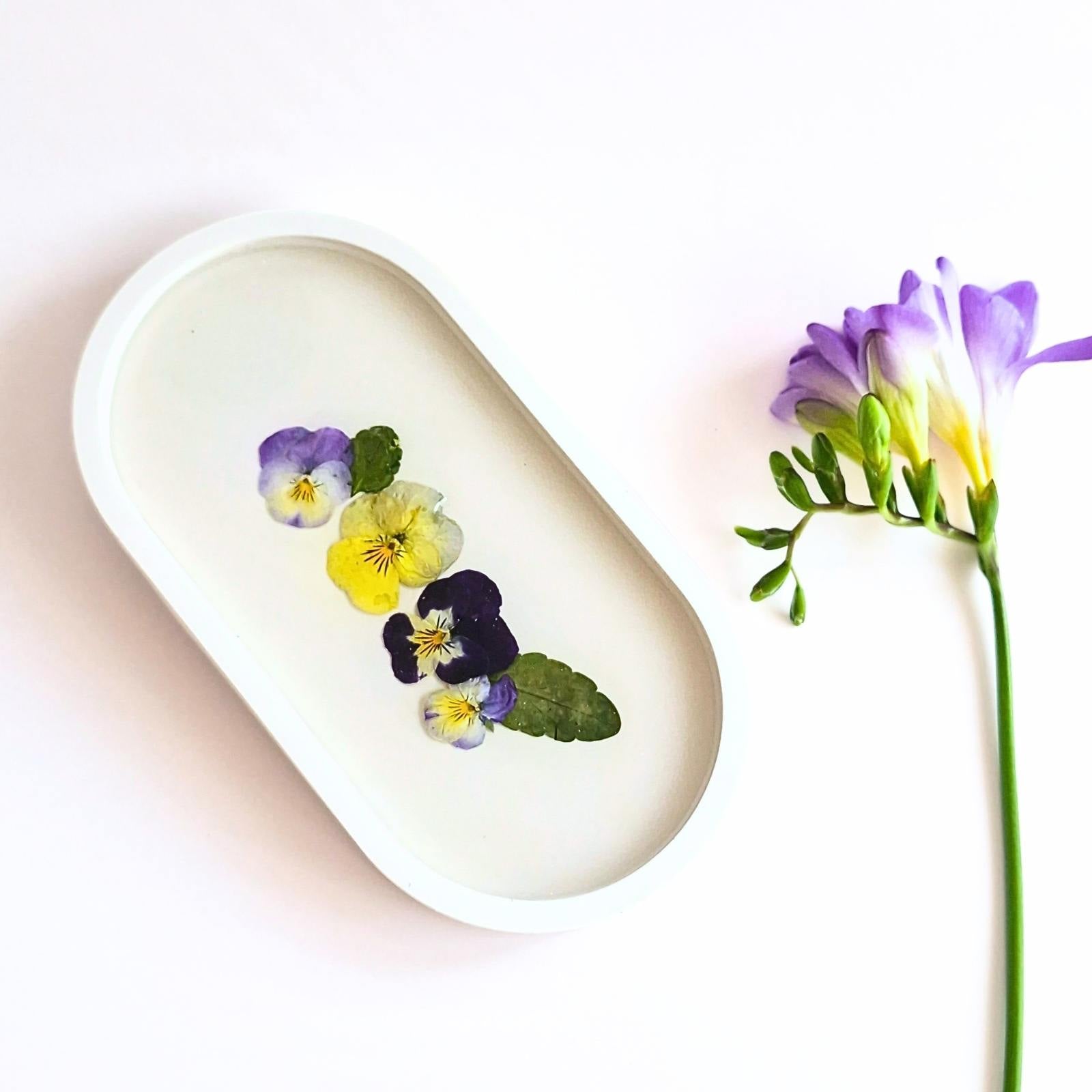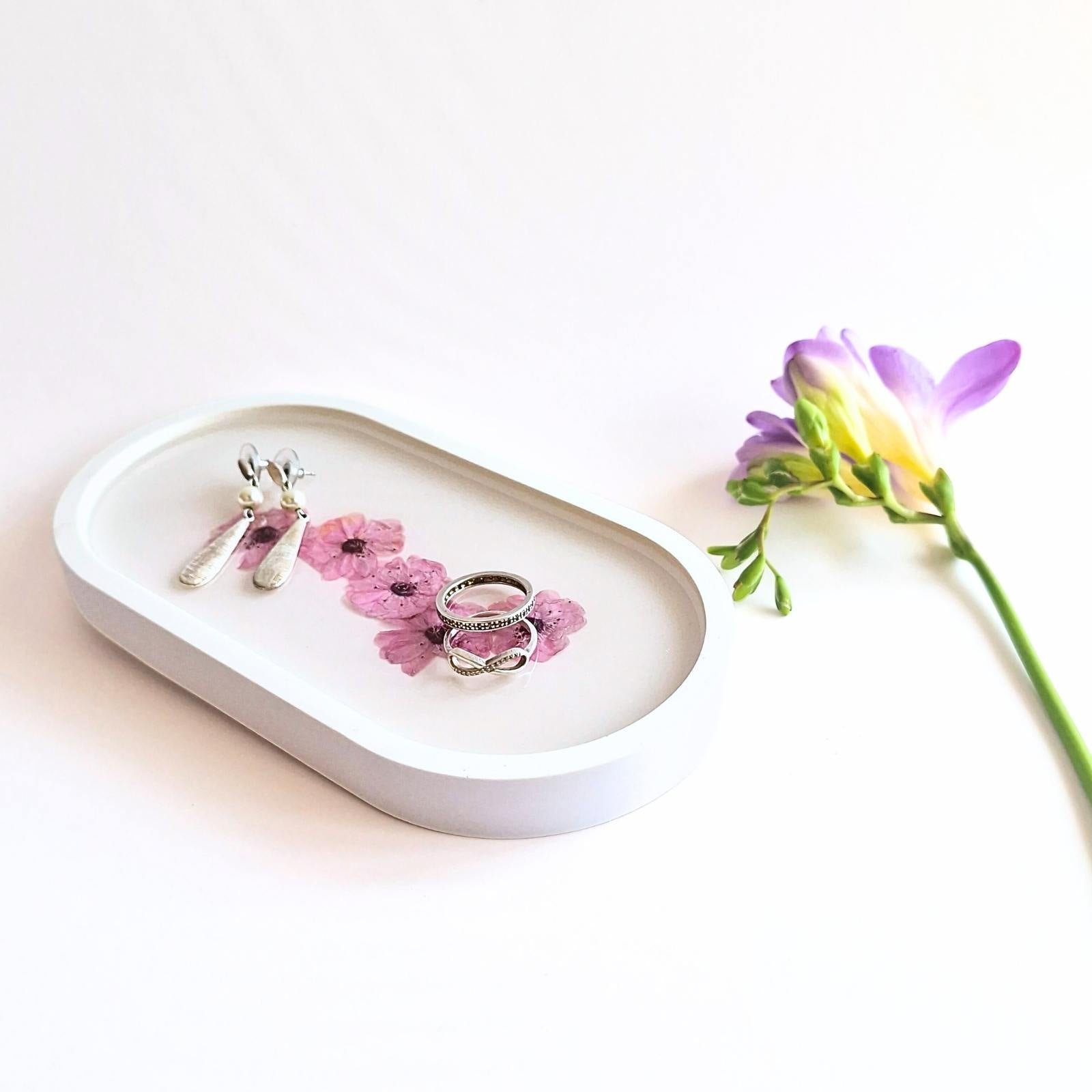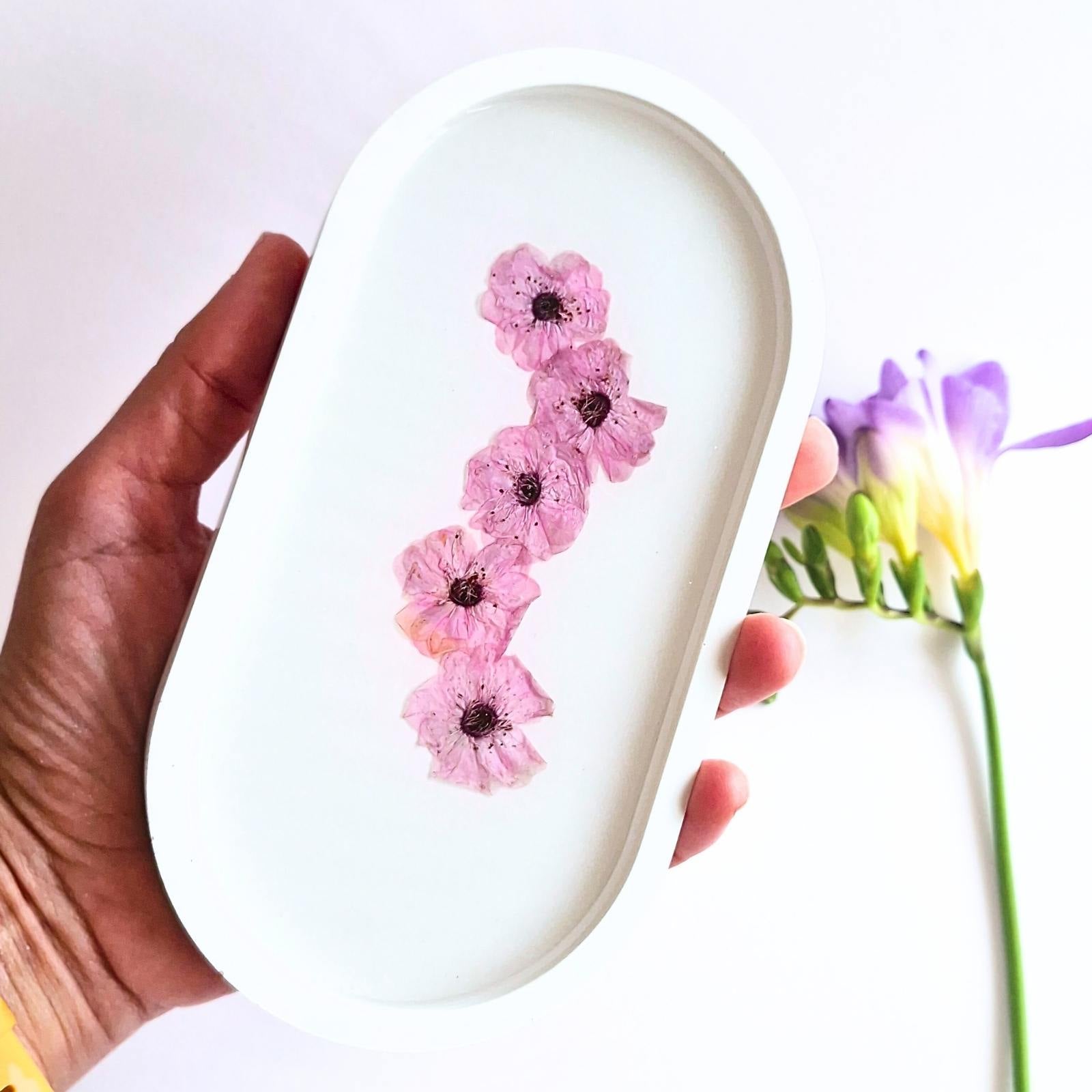 Handcrafted botanical oval decorative tray featuring real pressed flowers individually preserved in crystal-clear epoxy resin. Each tray showcases authentic botanicals set in durable acrylic resin, creating unique functional art perfect for jewellery display and holding other small precious belongings.