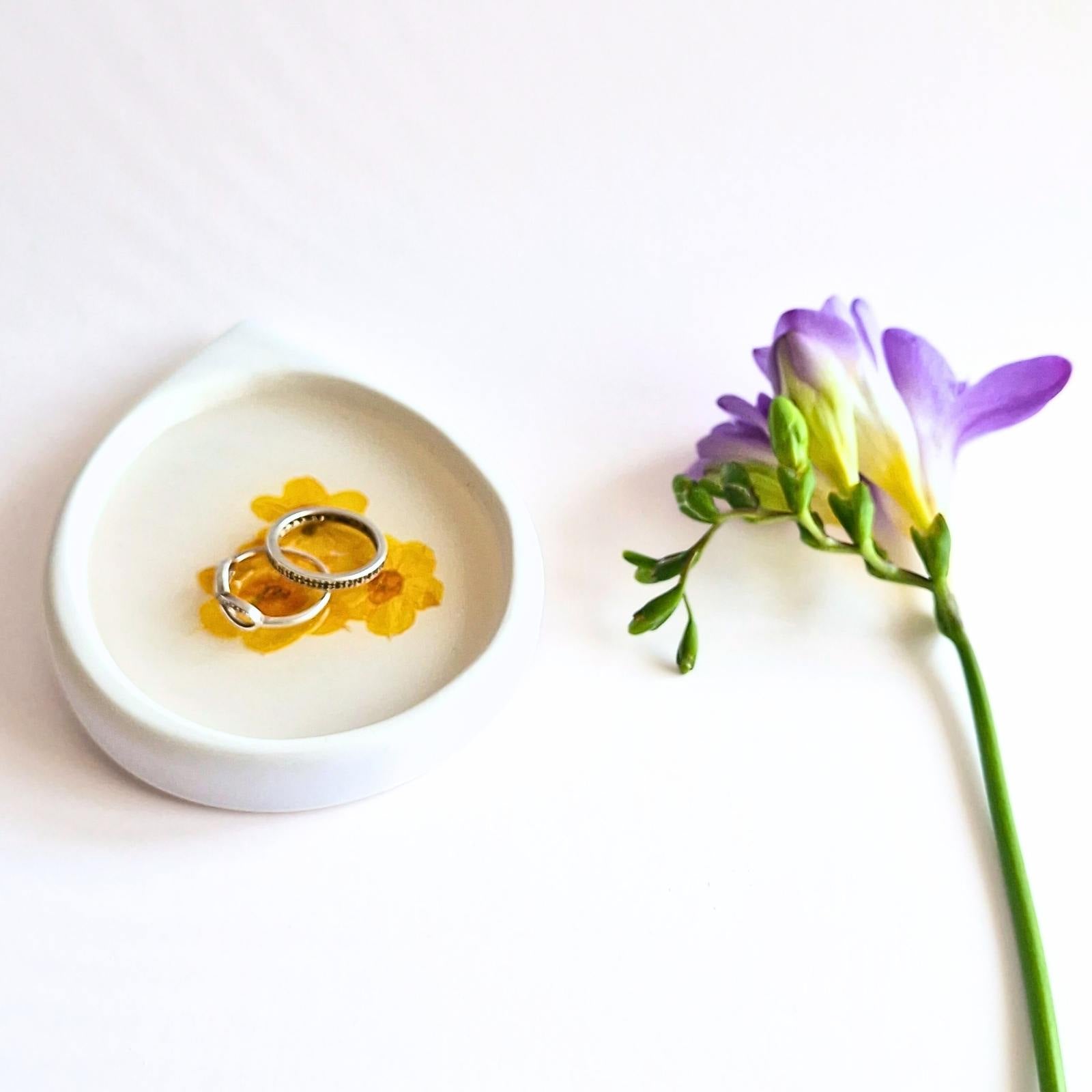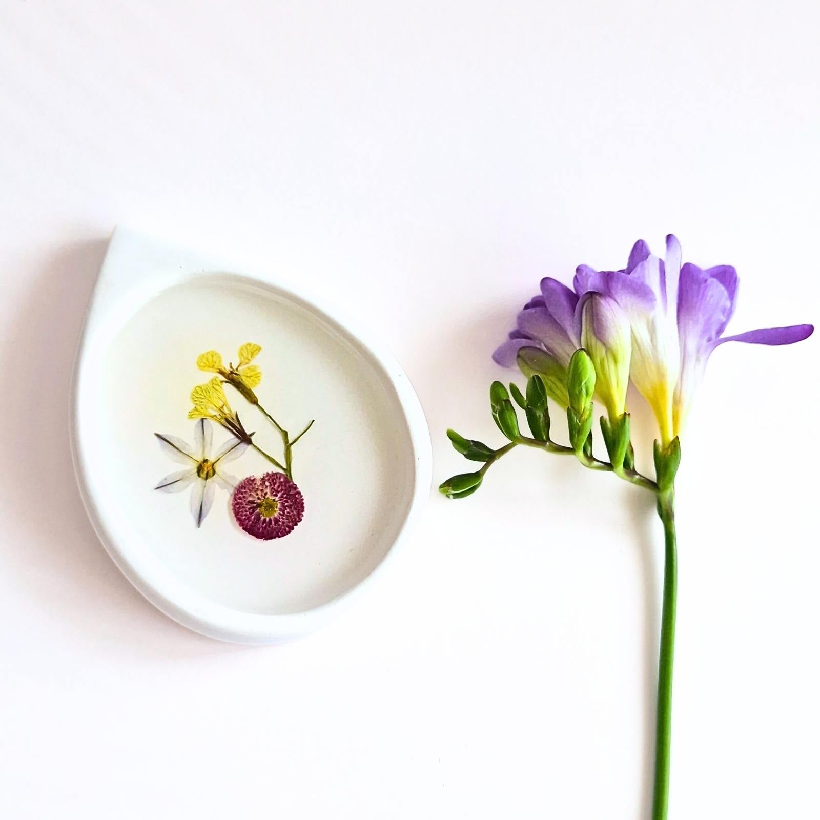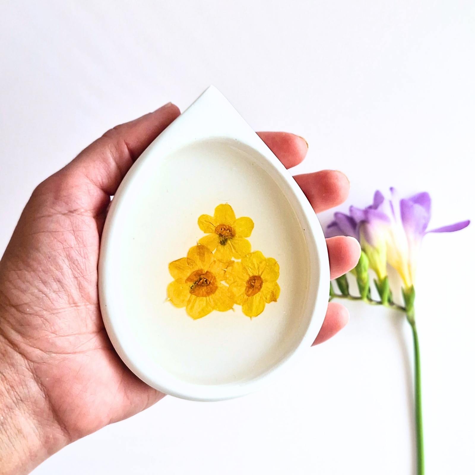 Handcrafted botanical ring dish featuring real pressed flowers individually preserved in crystal-clear epoxy resin. Each dish showcases authentic pressed flowers and botanicals set in durable acrylic resin, creating unique functional art perfect for jewellery display/storage.