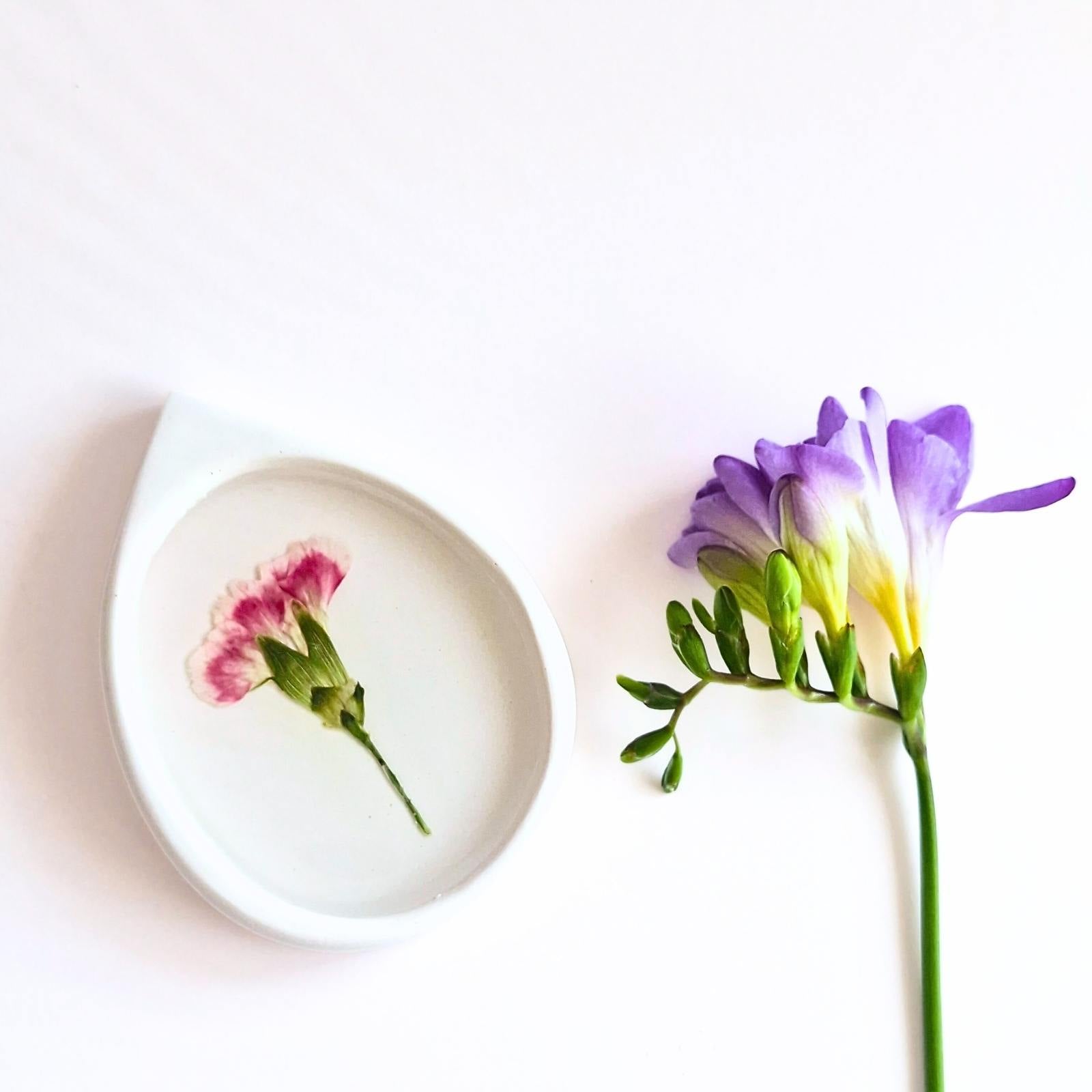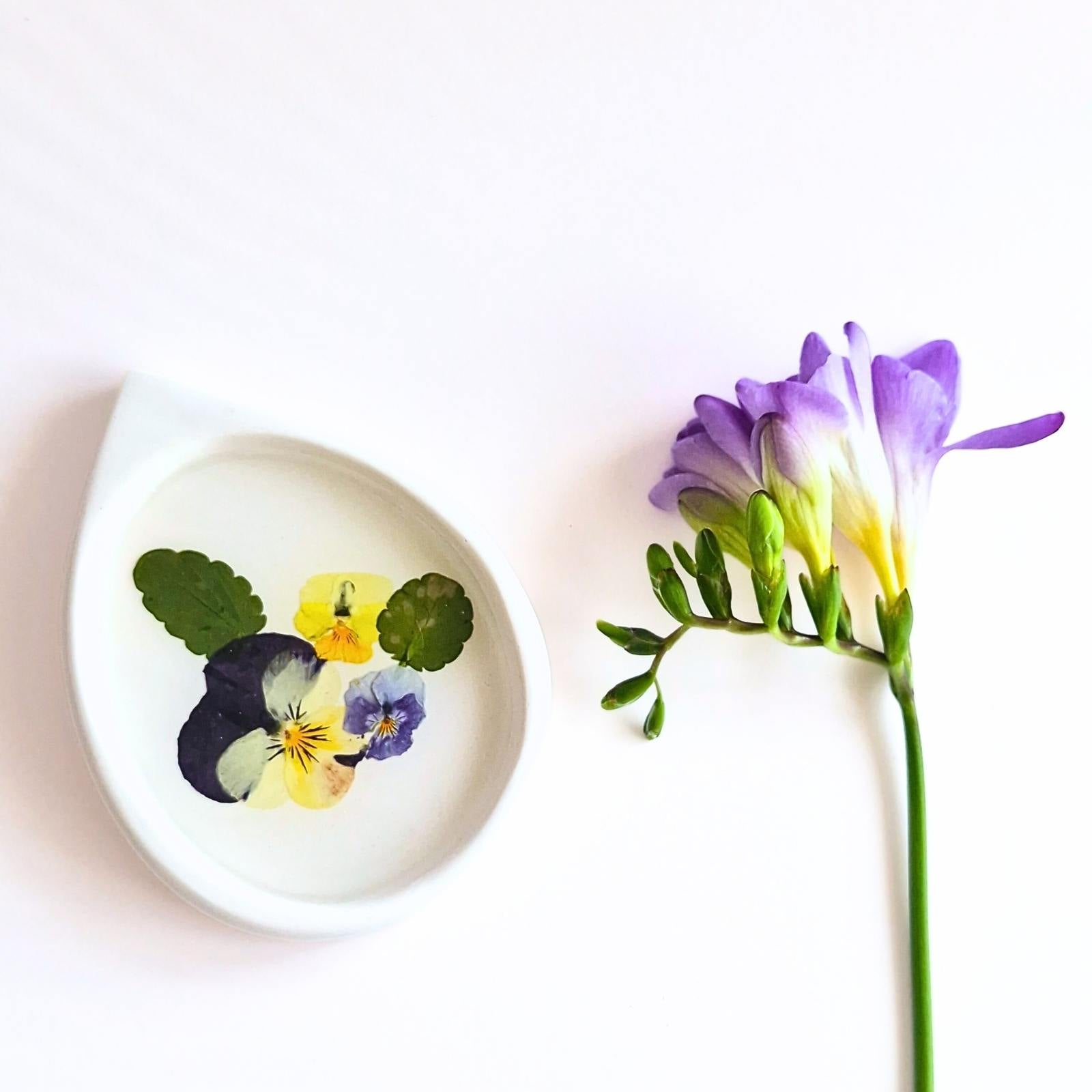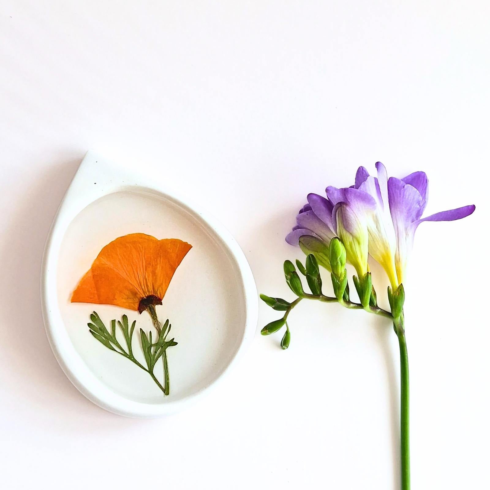 Handcrafted botanical ring dish featuring real pressed flowers individually preserved in crystal-clear epoxy resin. Each dish showcases authentic pressed flowers and botanicals set in durable acrylic resin, creating unique functional art perfect for jewellery display/storage.