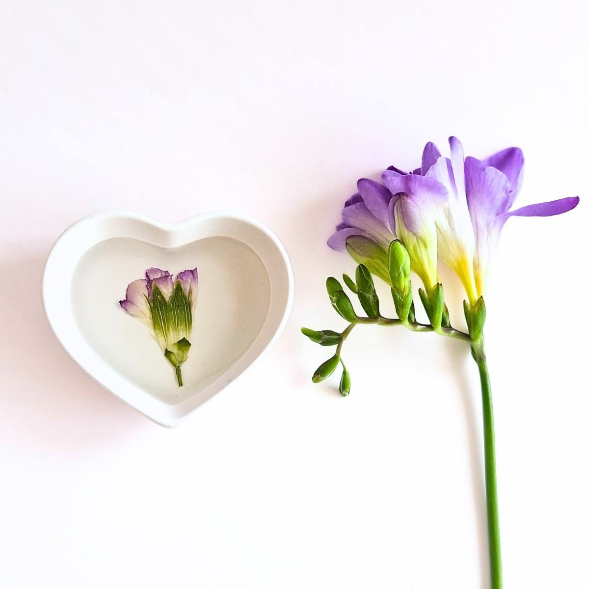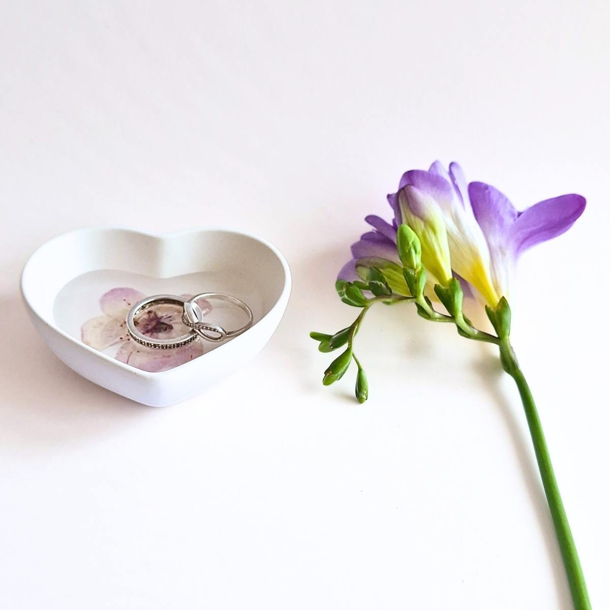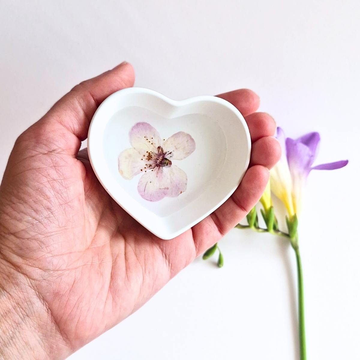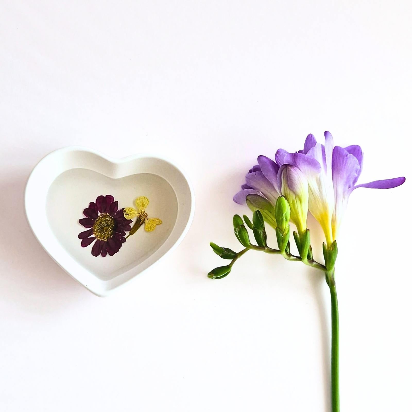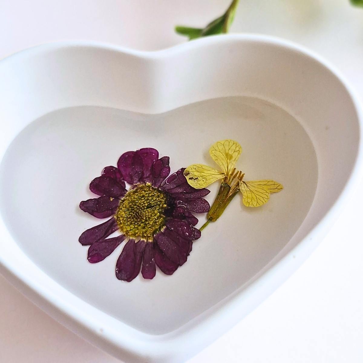 Handcrafted botanical heart dish featuring real pressed flowers individually preserved in crystal-clear epoxy resin. Each heart dish showcases authentic pressed flowers and botanicals set in durable acrylic resin, creating unique functional art perfect for jewellery display/storage.